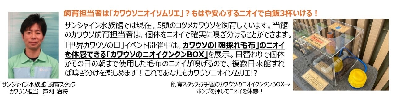 各開催期間中、カワウソの生態や生息地の環境問題、水族館での飼育についての解説パネルを設置。飼育スタッフ渾身のカワウソのニオイを体感できる「カワウソのニオイクンクンBOX」が登場します。