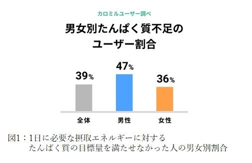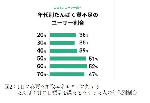 昨今の健康志向の高まりを受け、たんぱく質はアスリートやハードな筋トレにいそしむ人が摂る「プロテイン」以外にも健康な体づくりのため老若男女が意識的に摂取するようになっています。しかし、カロミルが2022年7月に実施したたんぱく質摂取量に関する調査では、男女別の摂取量をみると全体の約4割(図1)、年代別の摂取量では50代・60代の半数以上が必要量を摂取できていない(図2)ことが判明しました。