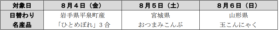 ※道の駅の日替わり名産品・お買物券の配布は各日10:00~