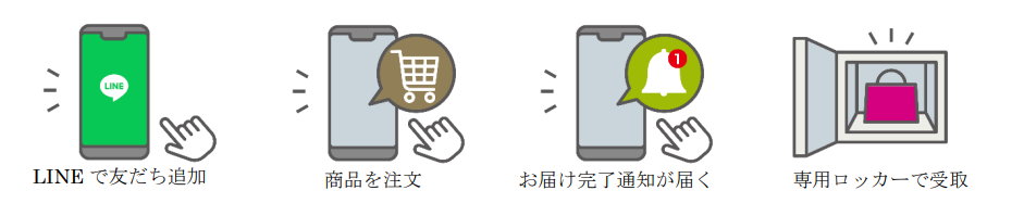 LINE の「トレくる by KEIO」公式アカウントを友だち追加すると、専用ECモールへのアクセスが可能になります。専用ECモール内の特設注文画面から、商品を選びクレジットカードで決済をすると、注文が完了します。注文後、お届けが完了すると LINE でお届け完了通知が届きますので、通知内のロッカー解錠用二次元コードを準備の上、専用ロッカーで商品をお受け取りいただきます。