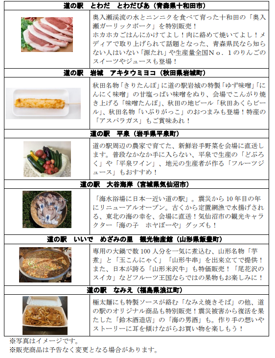 東北6県(青森県・秋田県・岩手県・宮城県・山形県・福島県)各県の「道の駅」が集結し、関東圏ではなかなか手に入らない商品やオリジナルアイテムを販売するほか、ご当地グルメも楽しめるイベントです。
