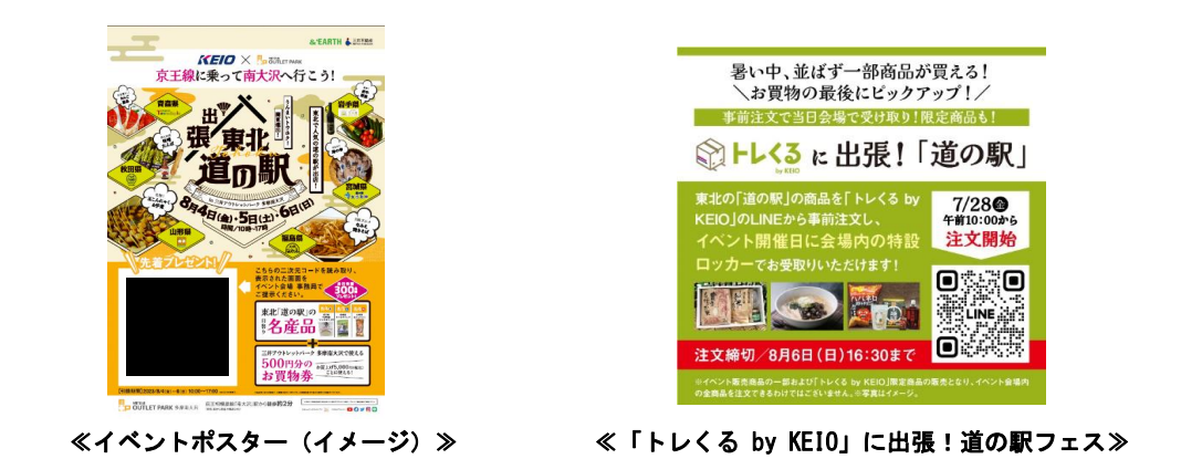 京王電鉄株式会社(本社:東京都多摩市、代表取締役社長:都村 智史)では、三井不動産商業マネジメント株式会社(本社:東京都中央区、代表取締役社長:大林 修)が企画する「出張!東北『道の駅』in三井アウトレットパーク多摩南大沢(以下「道の駅フェス」)」が8月4日(金)~8月6日(日)に開催されることに合わせ、「道の駅の日替わり名産品」ならびに「三井アウトレットパーク 多摩南大沢(以下「アウトレット」)」で使えるお買物券のプレゼントキャンペーンを実施します。