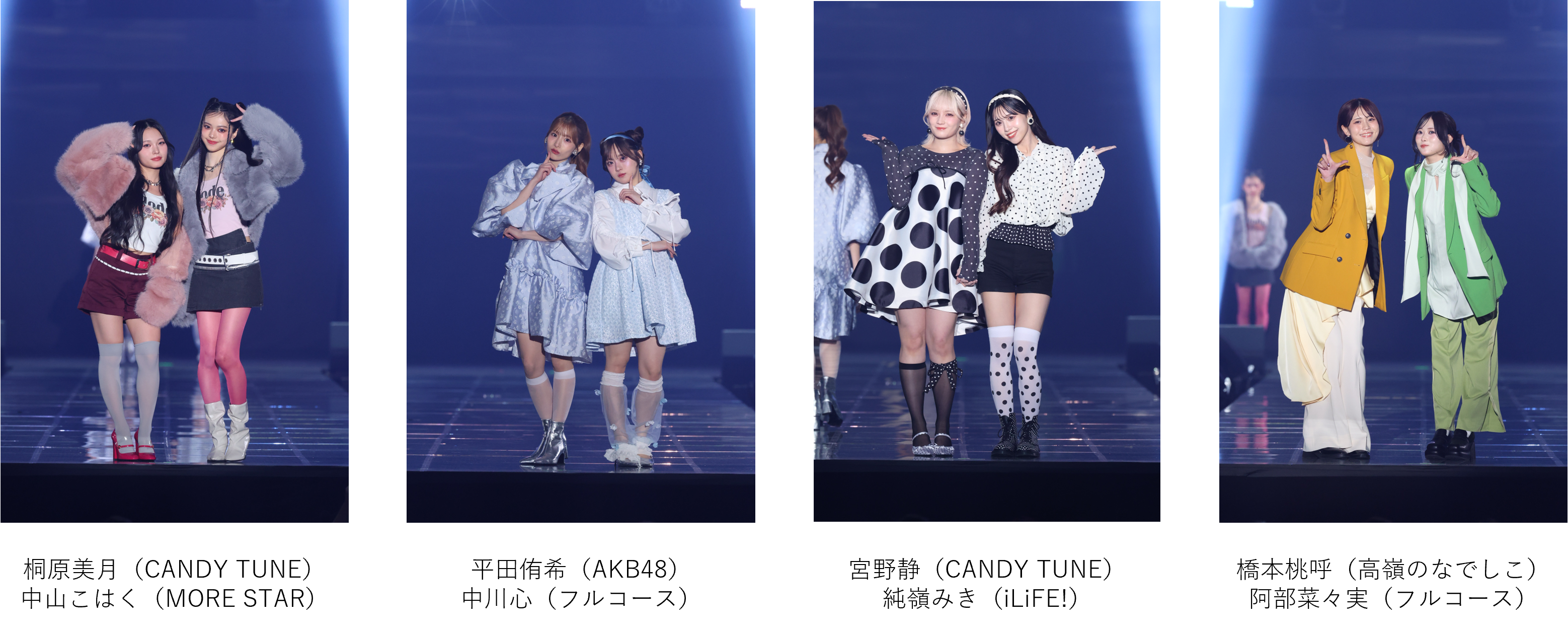 トークパートでは、桐原美月(CANDY TUNE)は「大好きな妹とランウェイを歩けてうれしかったです。息ぴったりだったよね」と、中山こはく(MORE STAR)と笑顔を交わし、平田侑希(AKB48)は「他のグループの同い年の方と一緒に出演できてうれしいです」と感想を。さらに、宮野静(CANDY TUNE)は「KAWAII LAB.で紫チームが集まることはありますが、こうして他のグループの紫担当と会えてよかったです。またコラボしたいです!」と語り、橋本桃呼(高嶺のなでしこ)も「ラストアイドルのときは、1期生の阿部さんが憧れの先輩だったので、ステージで再会できてうれしかったです」と振り返りました。普段は見ることのできない組み合わせによるステージは、ファンにとってもスペシャルな時間となりました。
