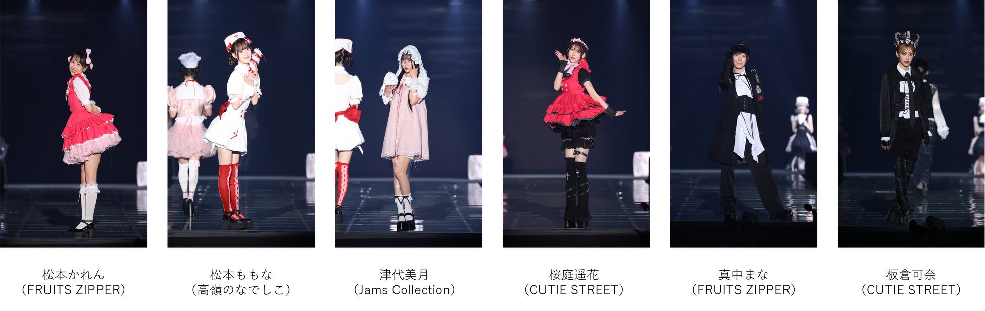 今回は、ブラックジャックとピノコを彷彿とさせるステージ演出とあって、まずは松本かれん(FRUITS ZIPPER)、川本笑瑠(CUTIE STREET)、松本ももな(高嶺のなでしこ)、津代美月(Jams Collection)、月深乃絢(AVAM)、桜庭遥花(CUTIE STREET)が白やピンクをベースにリボンなどをあしらったスタイリングで。そして、真中まな(FRUITS ZIPPER)、桔梗花香(AVAM)、水野瞳(Devil ANTHEM.)、丸山蘭奈(fav me)、板倉可奈(CUTIE STREET)は黒を基調にメンズライクな衣装でかっこよくランウェイに。ゴシックテイストかつエッジの効いたスタイルに観客の注目が集まりました。