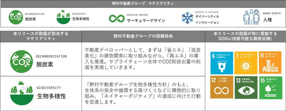 野村不動産ホールディングス株式会社(本社:東京都港区/代表取締役社長:新井 聡、以下「当社」) は、株式会社三菱UFJ 銀行(本社:東京都千代田区/代表取締役頭取:半沢 淳一)・株式会社三井住友銀行(本社:東京都千代田区/頭取 CEO:福留 朗裕)・株式会社みずほ銀行(本社:東京都千代田区/代表取締役頭取:加藤 勝彦)と、国際資本市場協会(以下「ICMA」)が策定した「グリーンボンドガイド(2025)」(以下「グリーンボンドガイド」)およびネイチャーボンドガイドに基づく「ネイチャーファイナンスおよびグリーンファイナンス」について3 行合計で100 億円の融資契約(以下「本取り組み」)を締結いたしました。なお「ネイチャーファイナンス」によるローン融資契約は3 行にとって初の取り組みであり、当社が融資先の第一号となります。