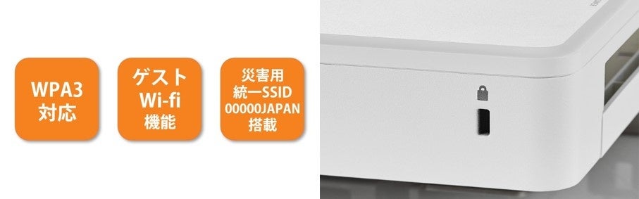 災害用統一SSID「00000JAPAN(ファイブゼロジャパン)」を搭載しています。大規模災害時に手持ちのスマートフォン、タブレットやパソコンへの通信環境をスムーズに提供します。