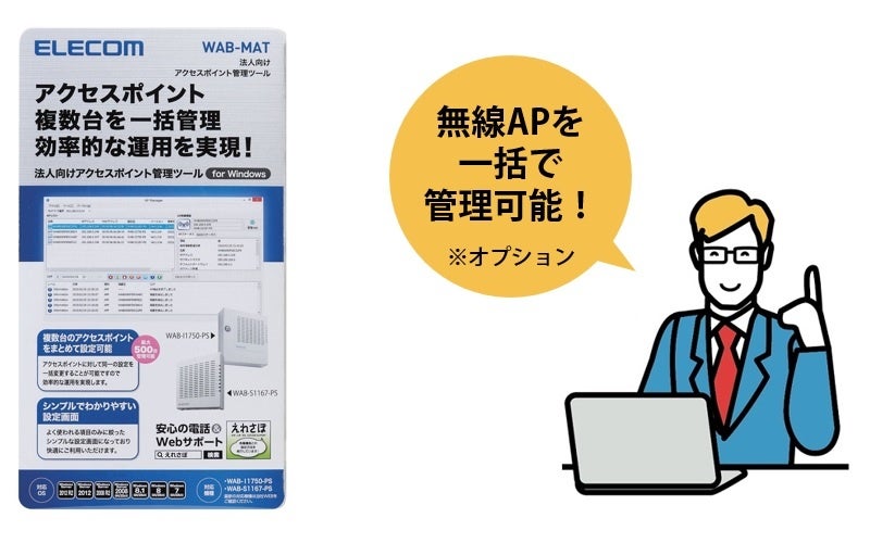 低コストで手軽に機器管理を実現できる、法人向けアクセスポイント管理ツール「WAB-MAT」に対応。複数のアクセスポイントをまとめて設定可能なため、多台数導入時の管理工数を削減できます。また、死活監視やログ管理によりトラブル発生時にすばやく対応できます。(管理ツール「WAB-MAT」は30日間無料トライアル付きの有償ソフトウェアです)