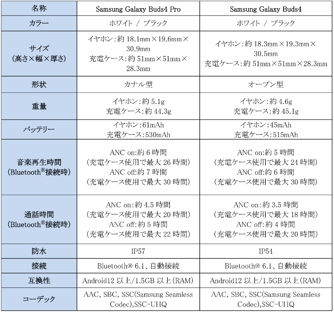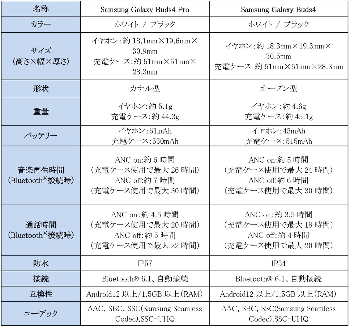 <主な仕様 : 「Samsung Galaxy Buds4 Pro」「Samsung Galaxy Buds4」>