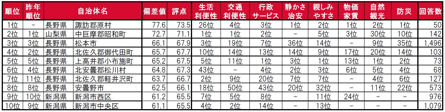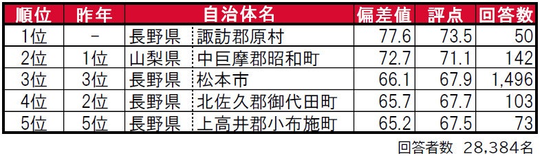 1位は昨年は回答者数が50名未満だったため集計対象外だった原村で、今年初登場1位です。東京・名古屋の両都市にアクセスできる立地の良さを活かし、行政と住民が一体となり移住者への積極的な支援を行う「長野県移住モデル地区」に指定されています。2位は「住みここち<山梨県版>」で4年連続で1位の昭和町で、甲府昭和ICやイオンモールなど便利な生活環境が整っており、今なお人口が増え続けています。