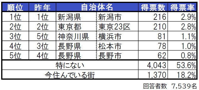 住みたい街は2年連続で1位新潟県新潟市、2位東京23区。3位は神奈川県横浜市。