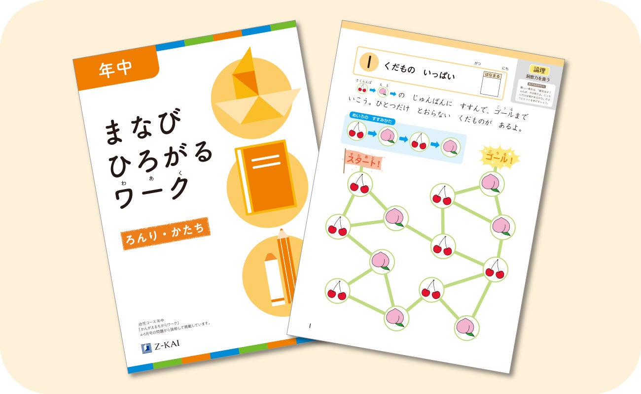 なぞるだけ、反復するだけの単調な学習はあきてしまいがち。だから、情報整理、仲間分けなど「ろんり・かたち」をテーマに幅広く学べる問題を揃えました。年中期の今に適切な難度なので、無理なく楽しく論理的思考力を養えます。