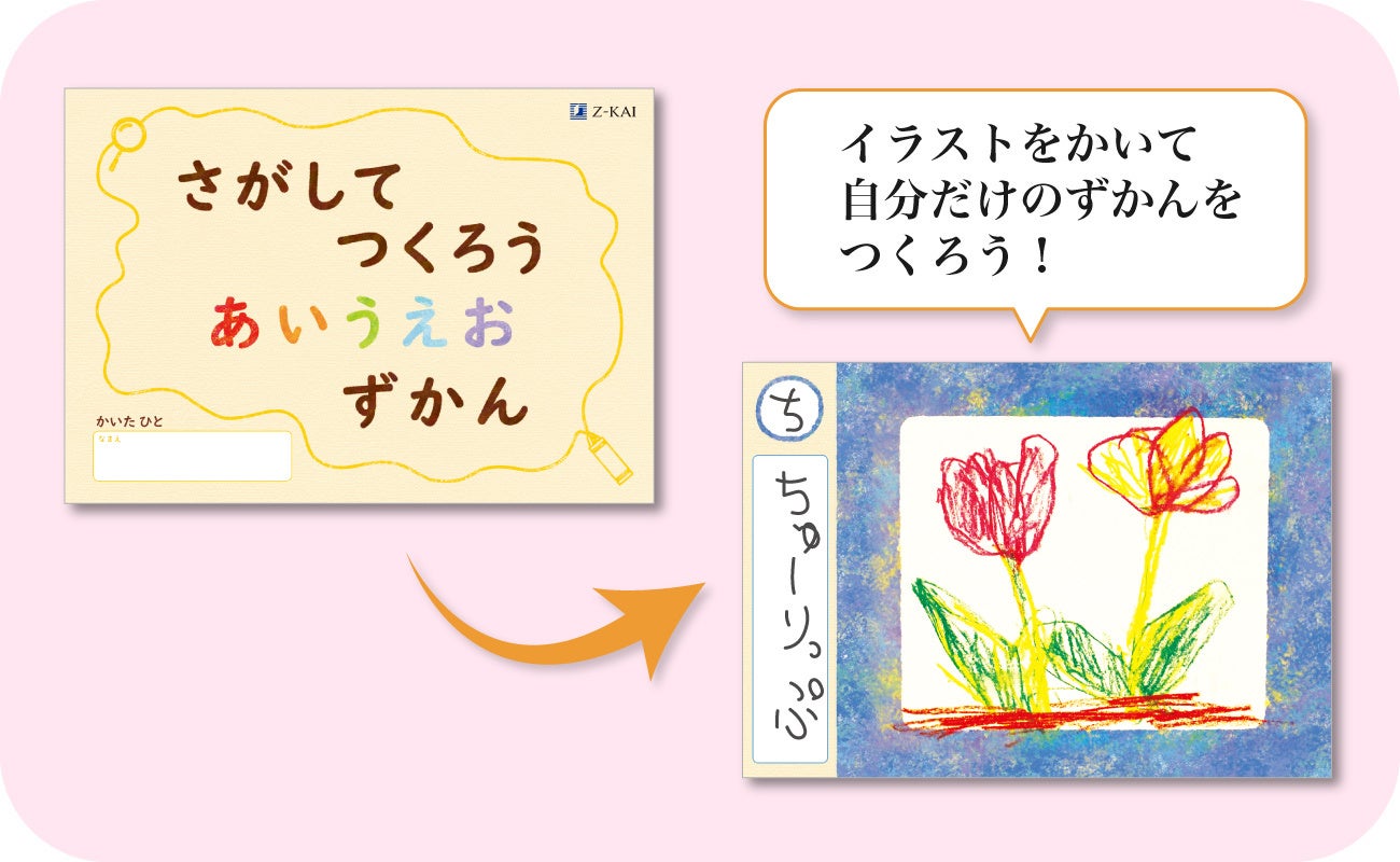 「あいうえお」で始まるものを見つけて絵にかき、自分だけのオリジナルの図鑑がつくれる冊子です。ひらがなやものの名前への興味を自然と引き出しながら、親子の思い出の一冊がつくれます。