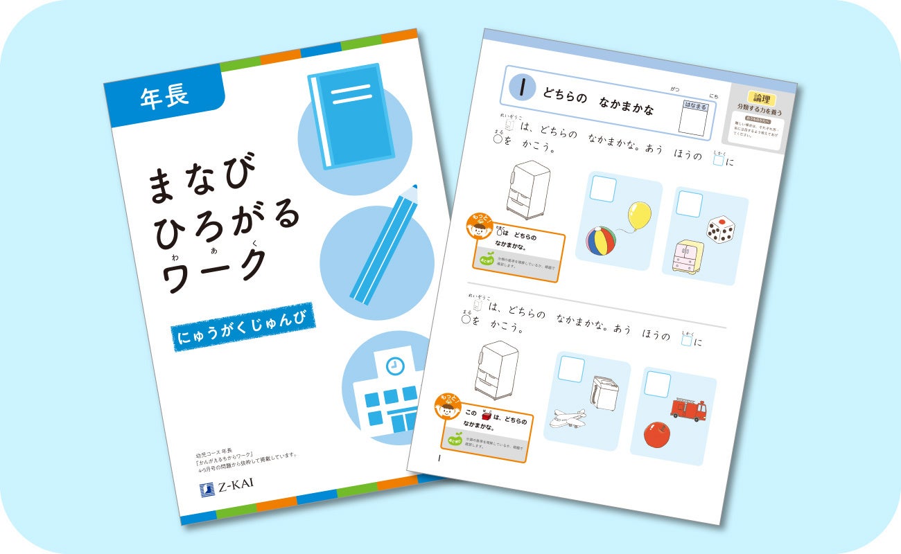 創立以来90年以上、人の学びに携わってきたZ会は、幼児期における学びの「質」こそ、その人自身の可能性を伸ばし、未来を切りひらいていくためにとても重要であると考えています。幼児コース(年少・年中・年長)は、むやみな先取りよりも、学ぶことを楽しいと感じ、主体的に学びに向かう姿勢「あと伸び力」を身につけることを大切に、ご家庭で「実体験」と「ワーク学習」の両輪で学べるコースです。