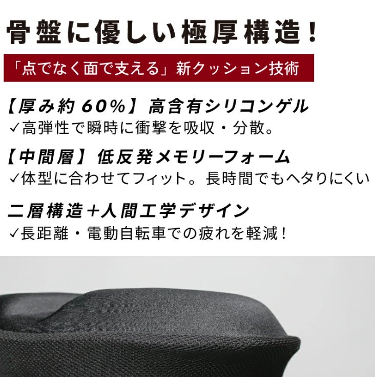 ●極厚60%高含有シリコンゲルと低反発フォームの二層構造で「お尻の痛み」を大幅軽減。