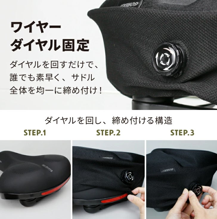 回すだけで、内部のワイヤーがカバー全体を均等に締め付け、サドルに密着させます。