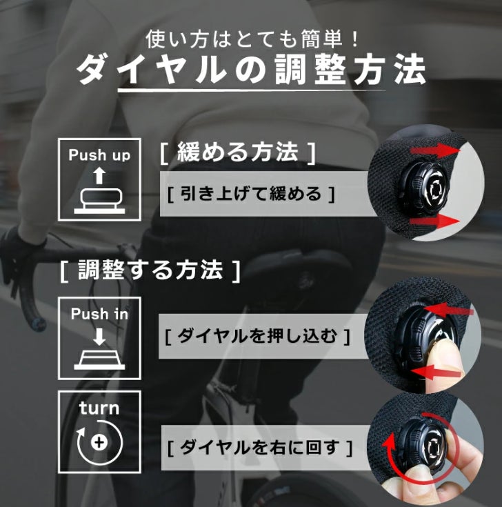 走行中ズレない・緩まない高密着固定! 従来の「紐で縛る」固定方法と異なり、後部のダイヤルを