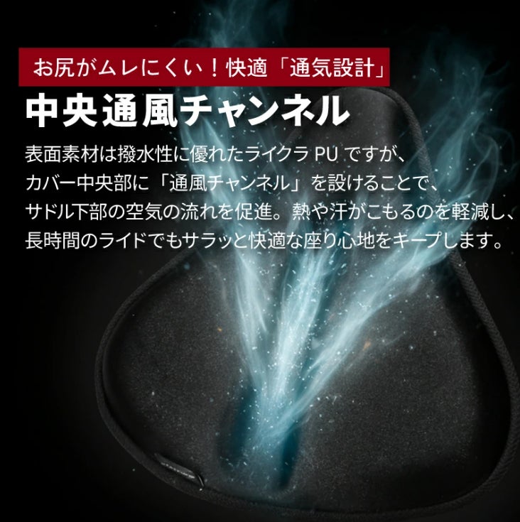 カバー中央部に「通風チャンネル」を設けることで、サドル下部の空気の流れを促進。