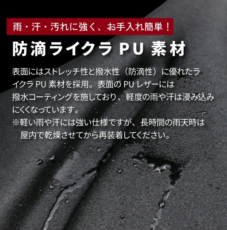 ●防滴ライクラPU素材で雨・汗・汚れに強く、お手入れ簡単で耐久性も抜群。