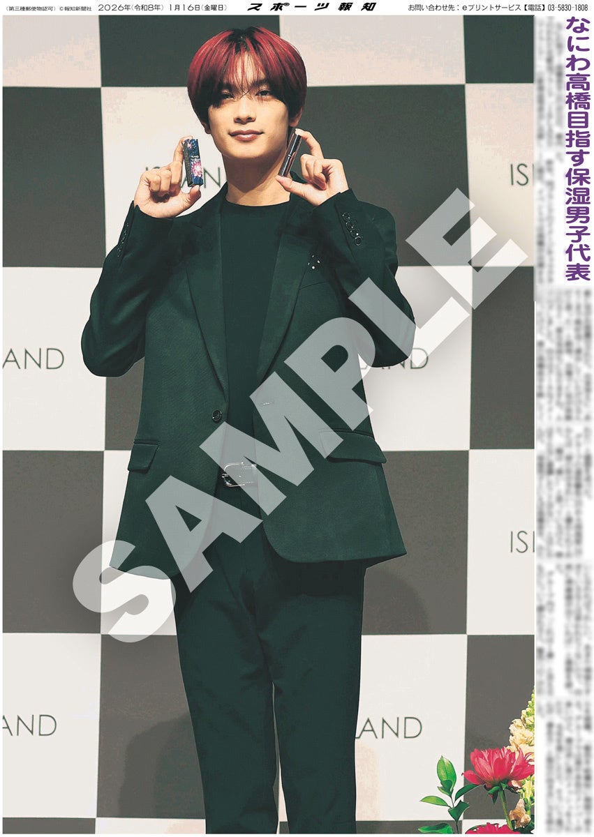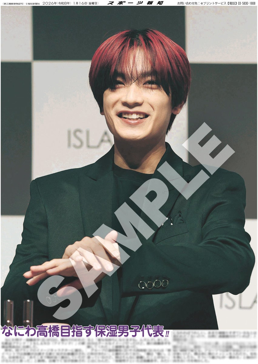 スポーツ報知を発行する報知新聞社(代表取締役社長・長谷川剛)は新聞の一部紙面をコンビニエンスストアのマルチコピー機からプリントできる「スポーツ報知コンビニプリント」サービスを展開中。スポーツ紙ならではの大きな写真を使った紙面をプリント版として販売しています。新たに1月16日付掲載、化粧品ブランド「ISLAND(アイランド)」の新商品発表会に出席したなにわ男子・高橋恭平の紙面を発売中です。全2種類になります。