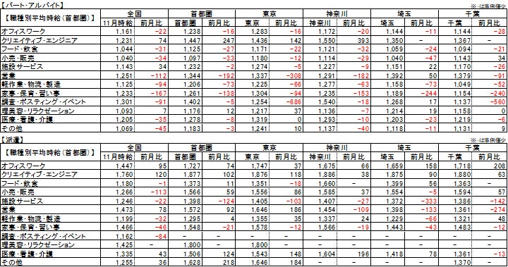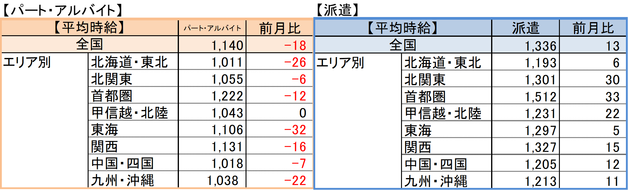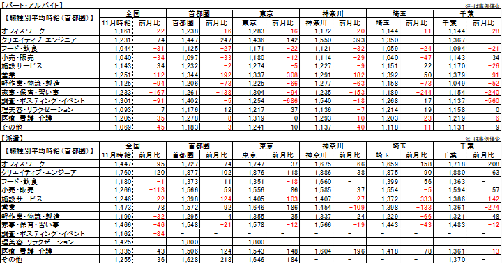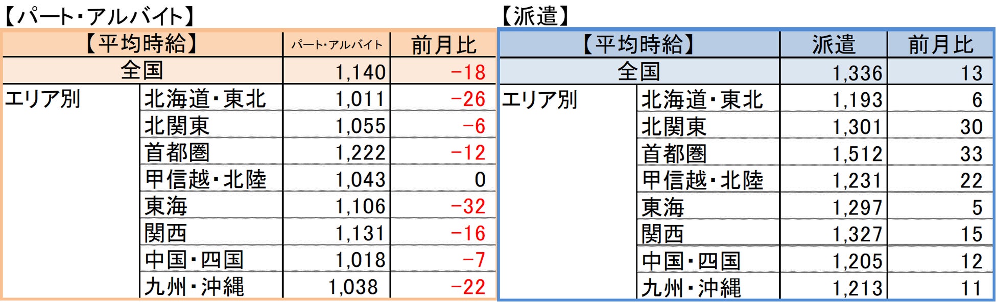 【パート・アルバイト】全国・全職種平均時給は1,140円。前月比-18円。前年同月比+4円。 【派遣】全国・全職種平均時給は1,336円。前月比+13円。前年同月比+14円。 【傾向】 パート・アルバイトの平均時給が下降に転じたのは、全職種平均より時給相場の低い「フード・飲食」「小売・販売」カテゴリの求人が増加したため。中でも「フード・飲食」カテゴリは、求人全体に占める比率が39.2%と、同条件で比較可能な2020年9月以降で過去最高となった。『給食の調理スタッフ』は大幅に増加した求人の1つで、一部では、経営破綻によって給食の提供が停止になった学校を大手企業が引き受けるため、新たに人手が必要になった動きが影響したと考えられる。 派遣の平均時給が上昇した主な要因は、首都圏を中心に、時給の高い『介護スタッフ』や『資格必須の保育士』の求人が多数掲載されたこと。特に介護業界では求人への応募や人材獲得を有利に進めるために、時給の引き上げや勤務時間・勤務日数を短くする等求人条件の見直しが行われており、各社の採用競争が激化しているものと考えられる。2024年2月には厚生労働省によって、介護職員1人あたり月6千円の賃上げが実施される方針も出されているため、今後、更に平均時給が上昇していくものと考えられる。 |
