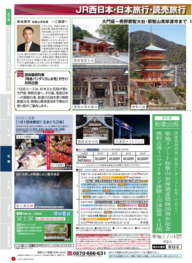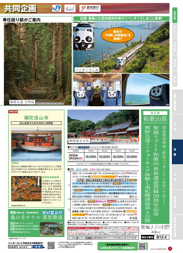 株式会社日本旅行(本社:東京都中央区、代表取締役社長:小谷野悦光)と株式会社読売旅行(本社:東京都中央区、代表取締役社長:貞広貴志)は、2025年2月、京都駅~紀伊勝浦駅間でパンダ柄を装飾した「特急パンダくろしお号」の団体貸切列車を往復運行させ、南紀勝浦や世界遺産・熊野古道を巡る2社連携ツアーを実施します。今年度の連携ツアーは、「あわら温泉まつり」に続く第2弾で、11月下旬より販売を開始します。
