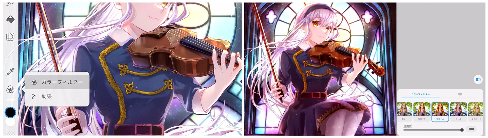 「CLIP STUDIO PAINT」の最新バージョンでは、シンプルモードでカラーフィルターや調整フィルター、ぼかしなどの効果フィルターでプレビューしながらの仕上げ調整ができるようになりました。また、画像読み込み後、すぐに線画抽出を実行できるようになり、紙に書いた線画を簡単に取り込んで塗ることができます。