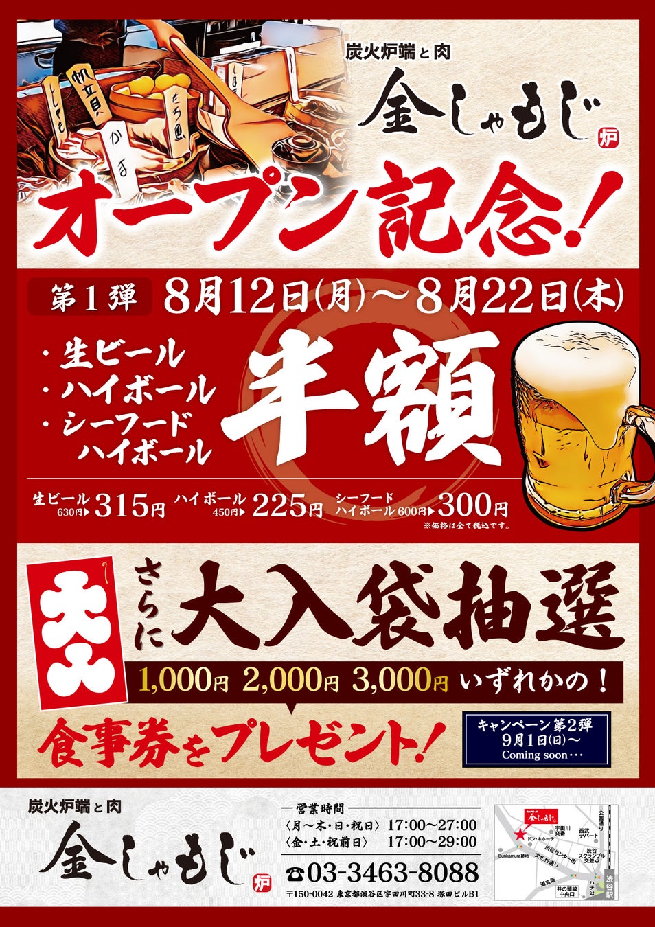 〈オープン記念イベント〉8/12(月・祝)~8/22(木)対象ドリンクが半額に!さらにご来店いただいたお客様へお食事券入りの『大入袋』をプレゼント