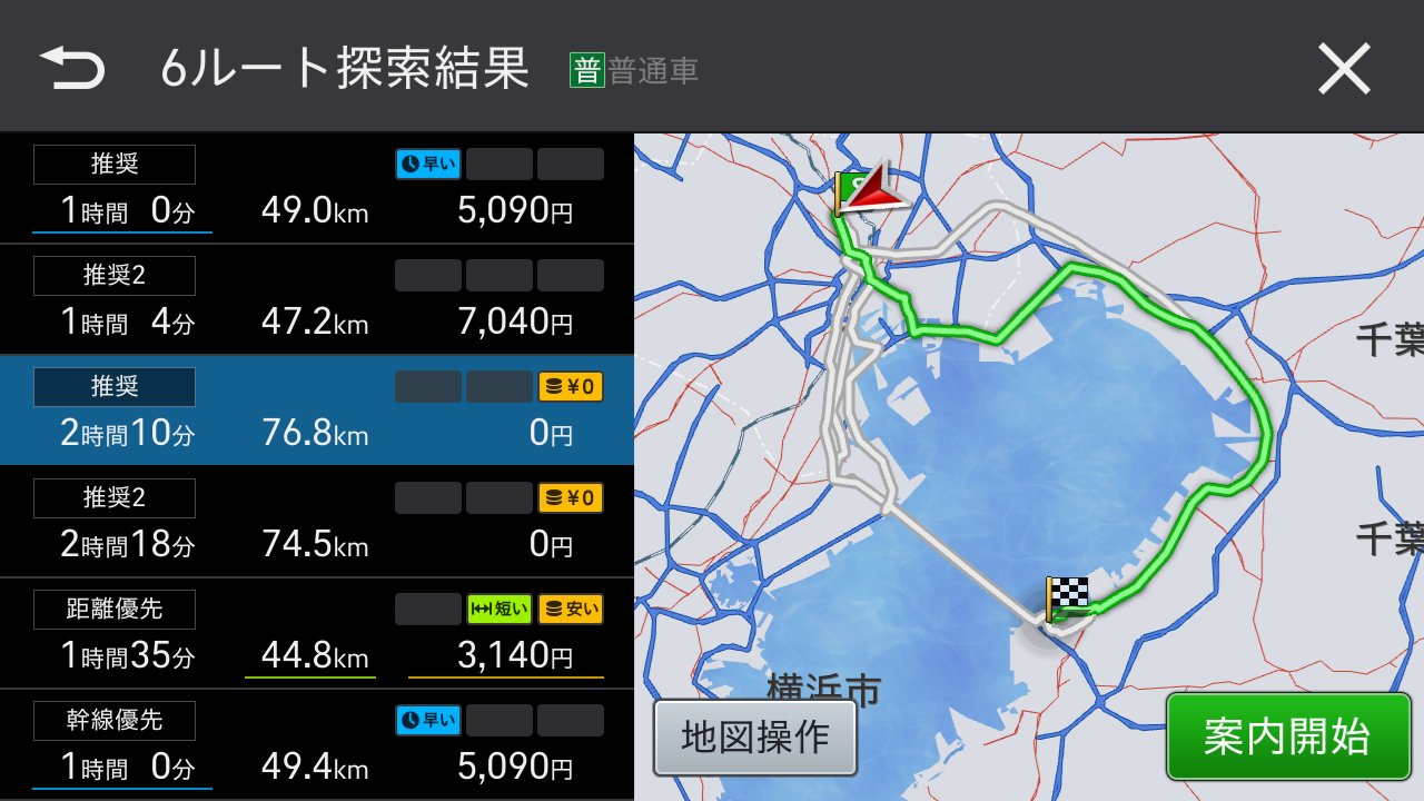 ・楽ナビ史上最速の検索を実現した「ルート探索」機能。6ルート探索結果画面では、目的地までのルート情報だけでなく、必要な時間・走行距離・高速料金も表示し、比較しながらルート選択が可能。