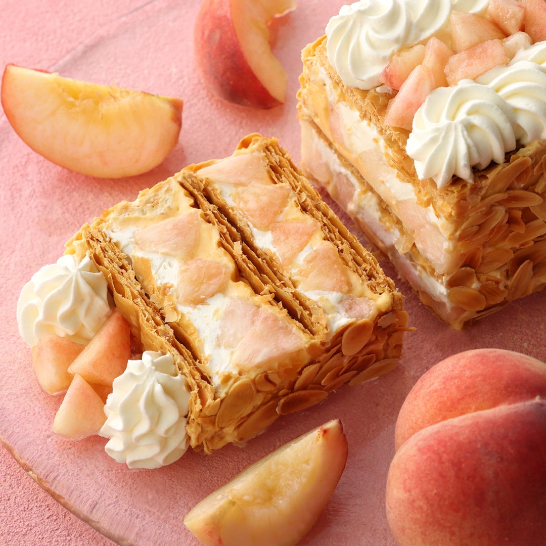 ジューシーな白桃とサクサクのパイ、なめらかなクリームが織りなす夏限定のハーモニーをお楽しみください。
