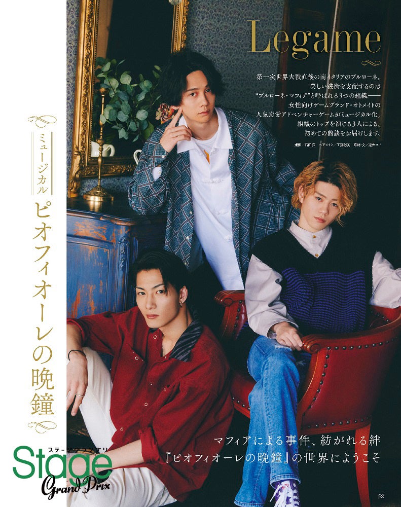 ミュージカル『ピオフィオーレの晩鐘』特集には作中に登場するマフィア3組のトップを演じる新里宏太さん、里中将道さん、横井翔二郎さんが登場。ほぼ初対面での取材となった今回。鼎談での初々しい様子と、そこから一転しクールな表情が満載のグラビアに注目してほしい。
