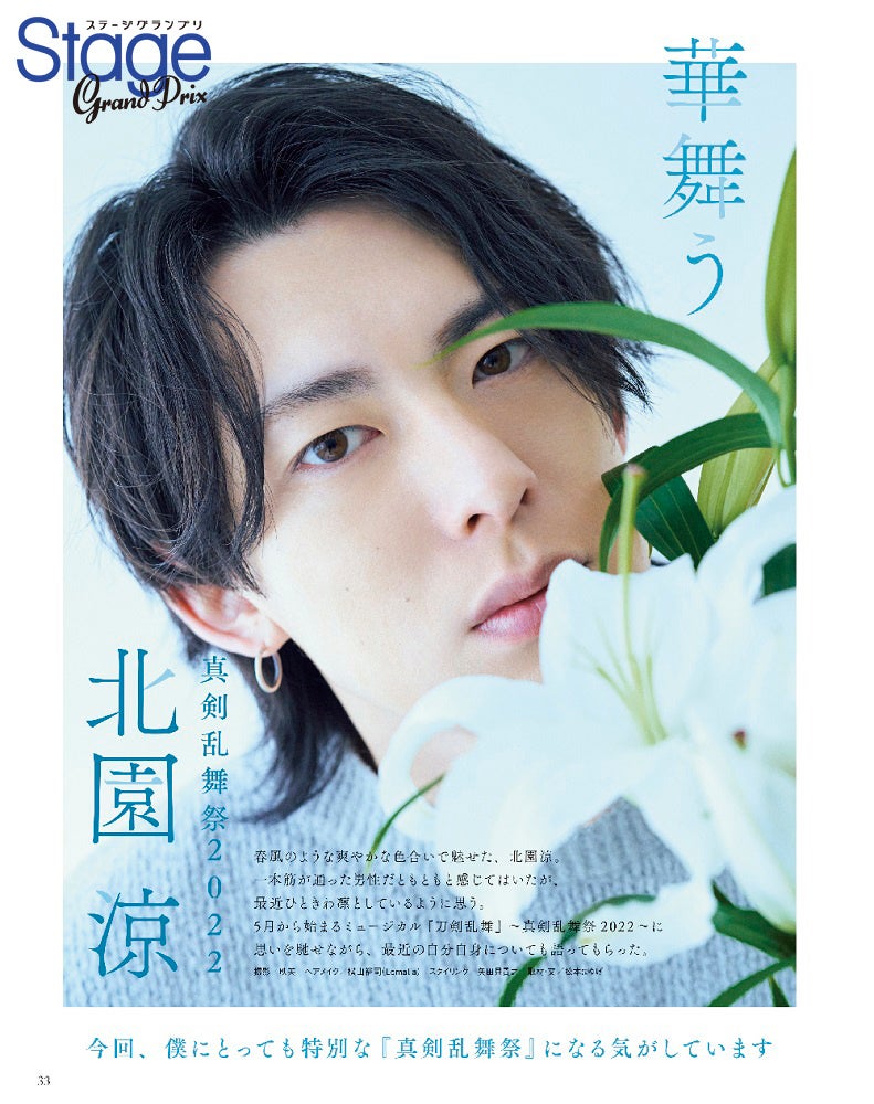 ミュージカル『刀剣乱舞』~真剣乱舞祭2022~特集では小狐丸役の北園涼さんが登場。花を使ったグラビアは、華やかで透明感溢れるものに。インタビューでは過去の『刀ミュ』大型公演を振り、療養復帰後の公演となった『真剣乱舞祭2018』でのキャストとの絆を感じるエピソードも飛び出した。