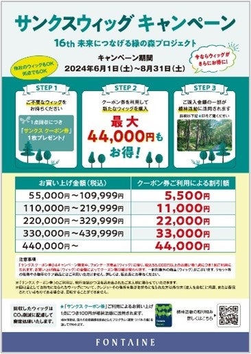 本キャンペーンは「フォンテーヌ 緑の森キャンペーン」として16年目を迎えた活動で、今年は、さらにお得にウィッグをお買い求めいただけるよう、キャンペーン名と一部内容をリニューアルいたしました。