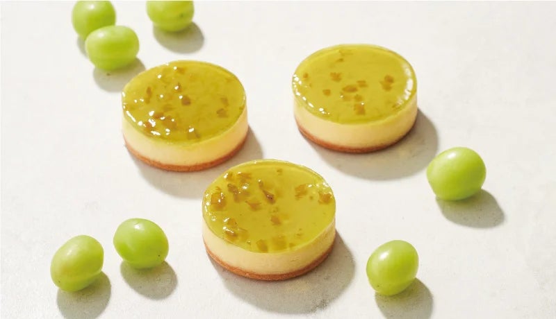 爽やかな酸味とコクのあるベイクドチーズ、しっとり香ばしいアーモンドサブレに、マスカットの華やかな甘みと香りが広がる艶やかなジュレを重ねました。シャインマスカットの果肉もアクセントになり、なめらかなチーズケーキにみずみずしさを加えます。
