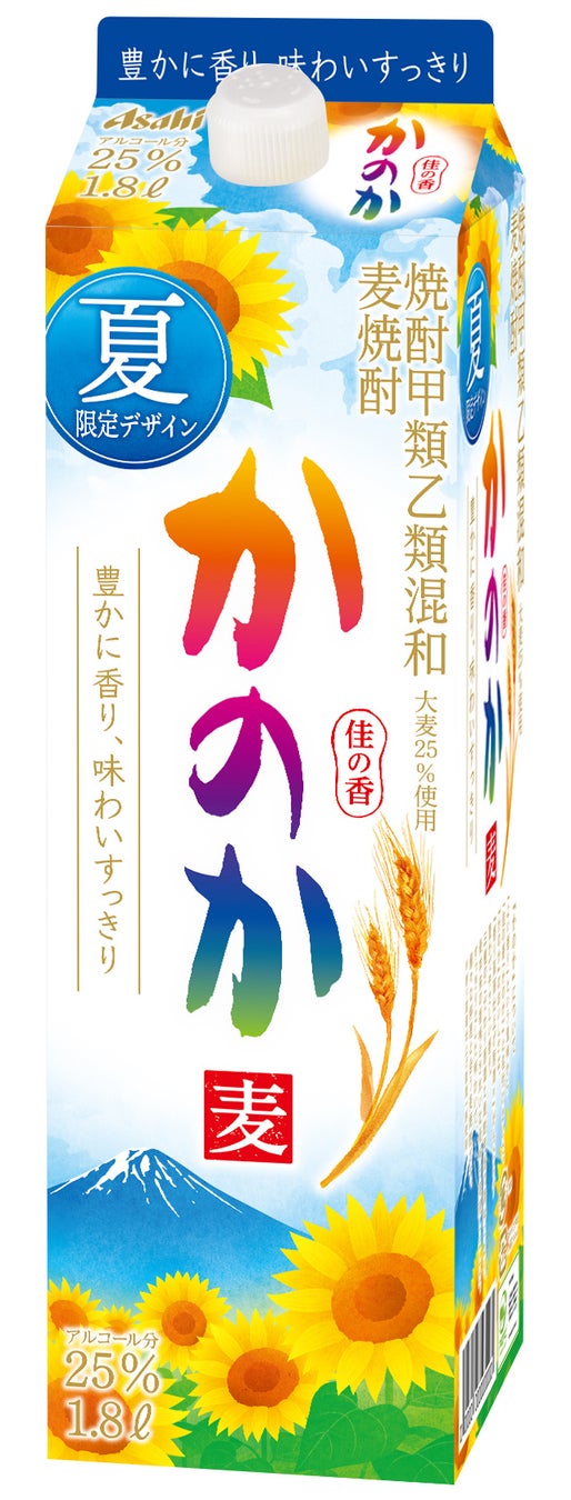 アサヒビール株式会社(本社 東京、社長 塩澤賢一)は、焼酎甲類乙類混和売上No.1ブランド※1「かのか」から『麦焼酎 かのか 25度 紙パック 1.8L 22年夏限定デザイン』を5月24日に期間限定で発売します。
