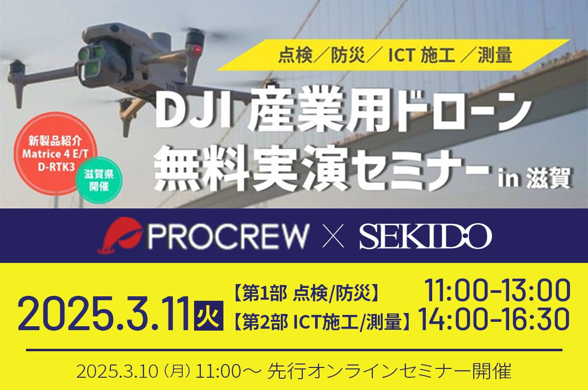 DJI(ディージェイアイ)正規販売代理店としてドローンビジネスの最先端を支える株式会社セキド(本社:東京都港区、代表取締役:⼤下貴之)は、株式会社プロクルー(本社:滋賀県長浜市、代表取締役:酒井正裕)と共同で3月11日(火)に、高所点検、防災、ICT施工、測量といった業務におけるドローン活用について、デモ飛行や取得データを交えてご紹介する「DJI産業用ドローン 無料実演セミナー」を滋賀県米原市で開催、10日(月)には先行オンラインセミナーを配信いたします。