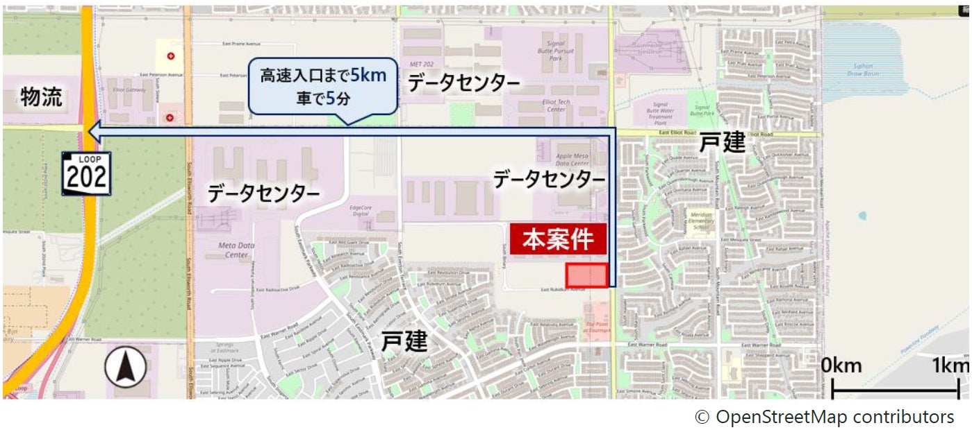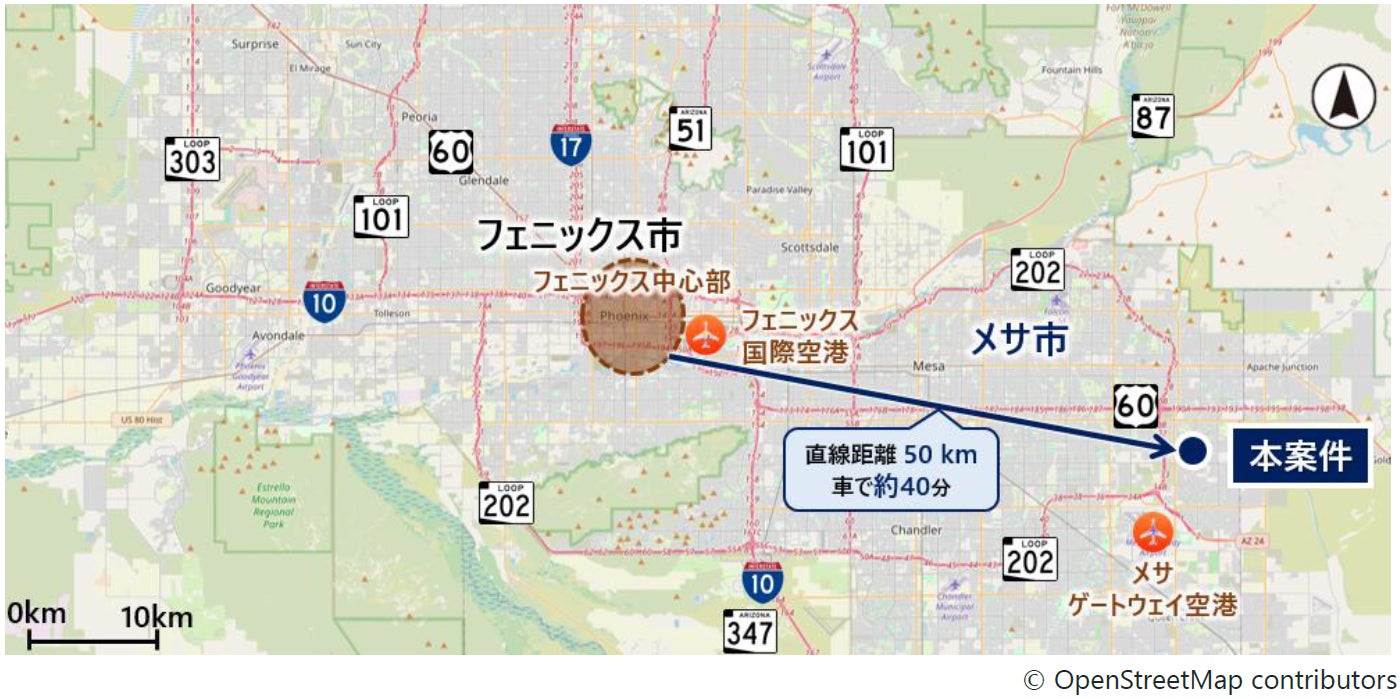 メサ市は、アリゾナ州の中部に位置する人口約51万人の都市で、近年人口増加や企業進出が著しいフェニックス都市圏(人口約519万人)に位置しています。開発エリアは、高速道路・空港へのアクセスが優れており、大手企業のデータセンターや物流施設が多数立地するなど、今後も物流施設需要が見込まれます。
