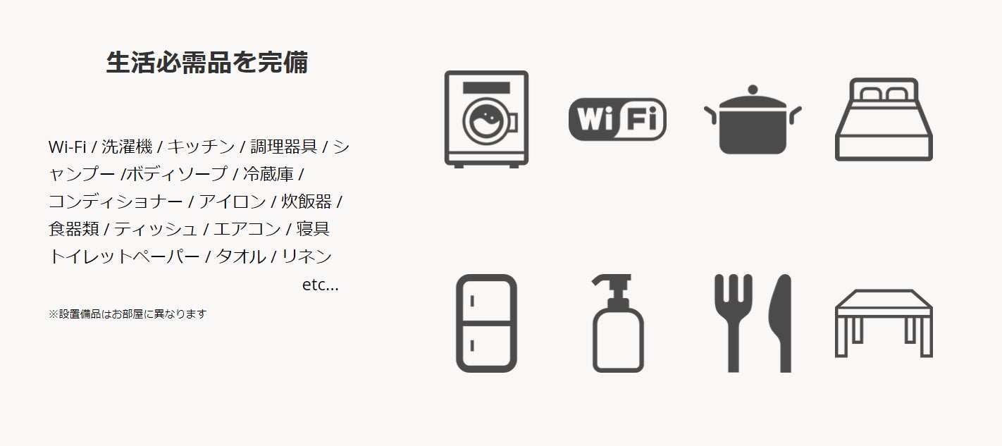 家具家電付き、即入居可のため、一時帰国や本帰国に即座に対応しています。