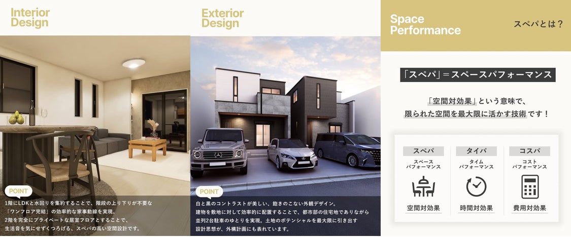 昨今、物価高や金利上昇が進んでおりますが、当社では限られた土地や変形地においても、高い設計力等で住宅を建設することで、都心駅近の好立地に、手の届く価格の住宅の提供に努めております。また、外観は一見コンパクトでありながらも、住宅の中に一歩足を踏み入れると、窮屈さを感じさせない、暮らしやすさにこだわった住空間が広がります。山崎実業株式会社の商品を使用した「見せる収納」や「浮かせる収納」を用いることで、さらに住空間を無駄なく、有効活用する「スペースパフォーマンス(スペパ)」の向上が実現するため、当社が提供するコンパクトな住宅との親和性が高いと言えます。