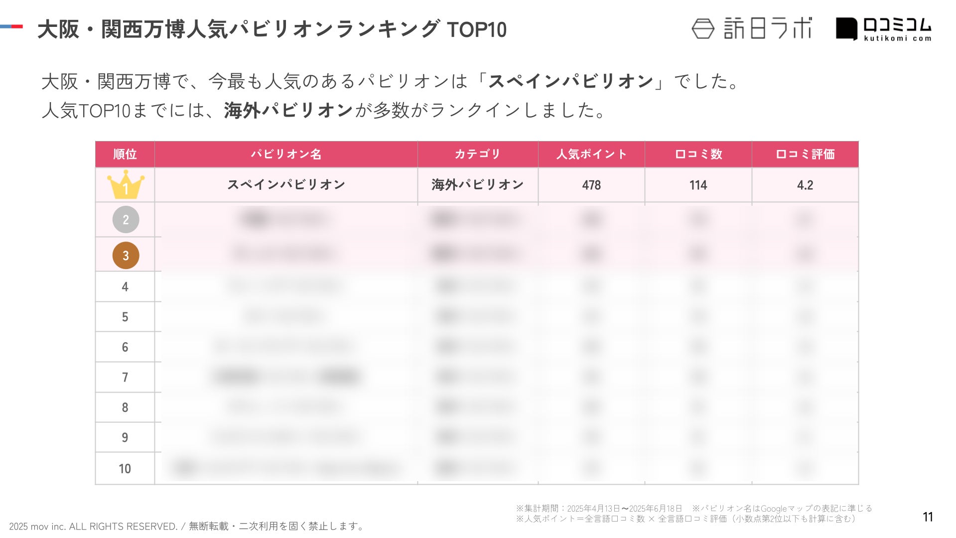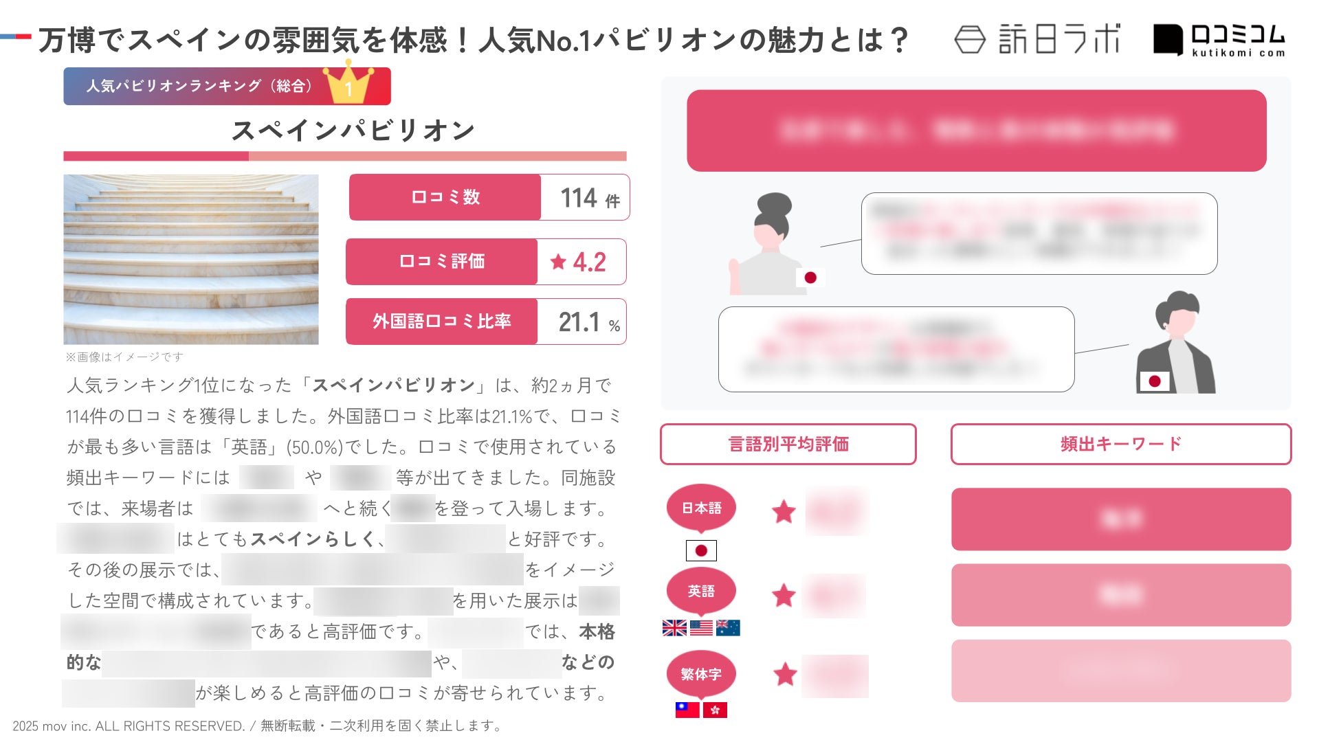 業界最大級のインバウンドビジネスメディア「訪日ラボ」及び 店舗向け集客一元化プラットフォーム「口コミコム」を運営する株式会社mov(代表取締役:渡邊 誠、本社:東京都渋谷区、以下mov)は、大阪・関西万博のパビリオンに寄せられた最新の口コミデータから、独自の『大阪・関西万博人気パビリオンランキング』を発表しました。