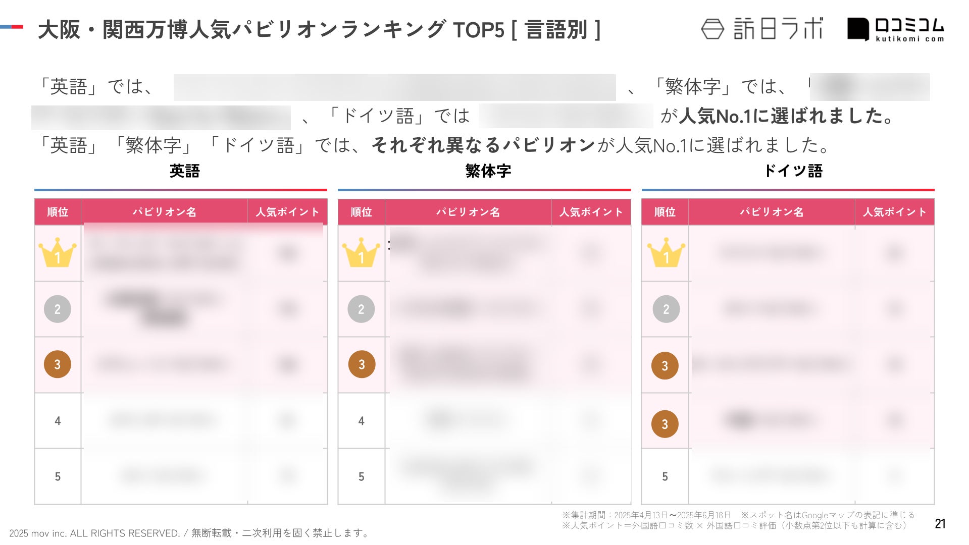 また、言語別の人気パビリオンランキングにおいて、「英語」「繁体字」「ドイツ語」は、それぞれ異なるパビリオンが人気No.1に選ばれました。