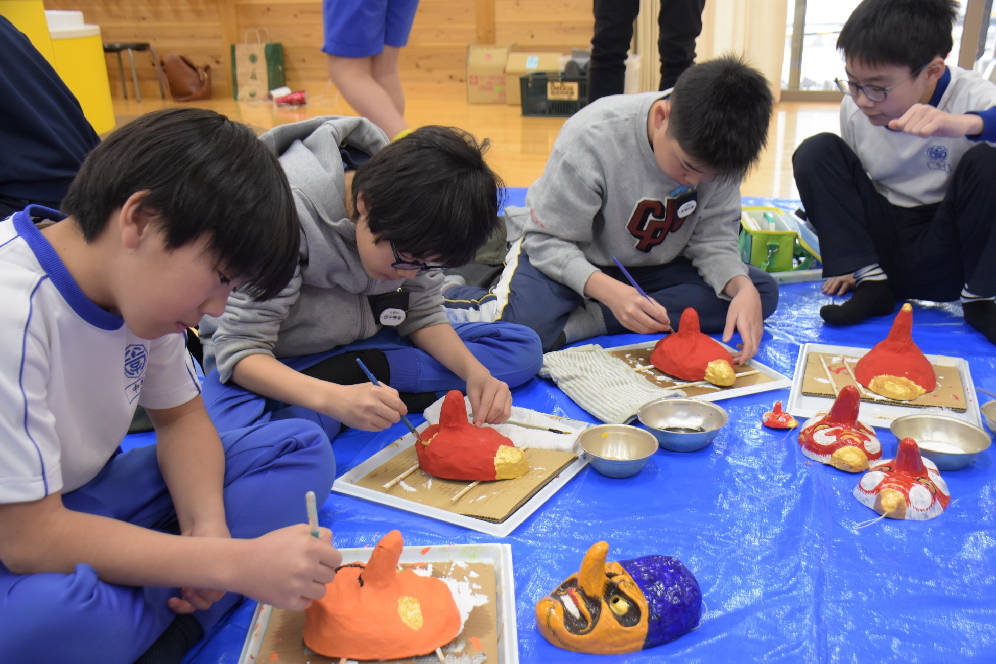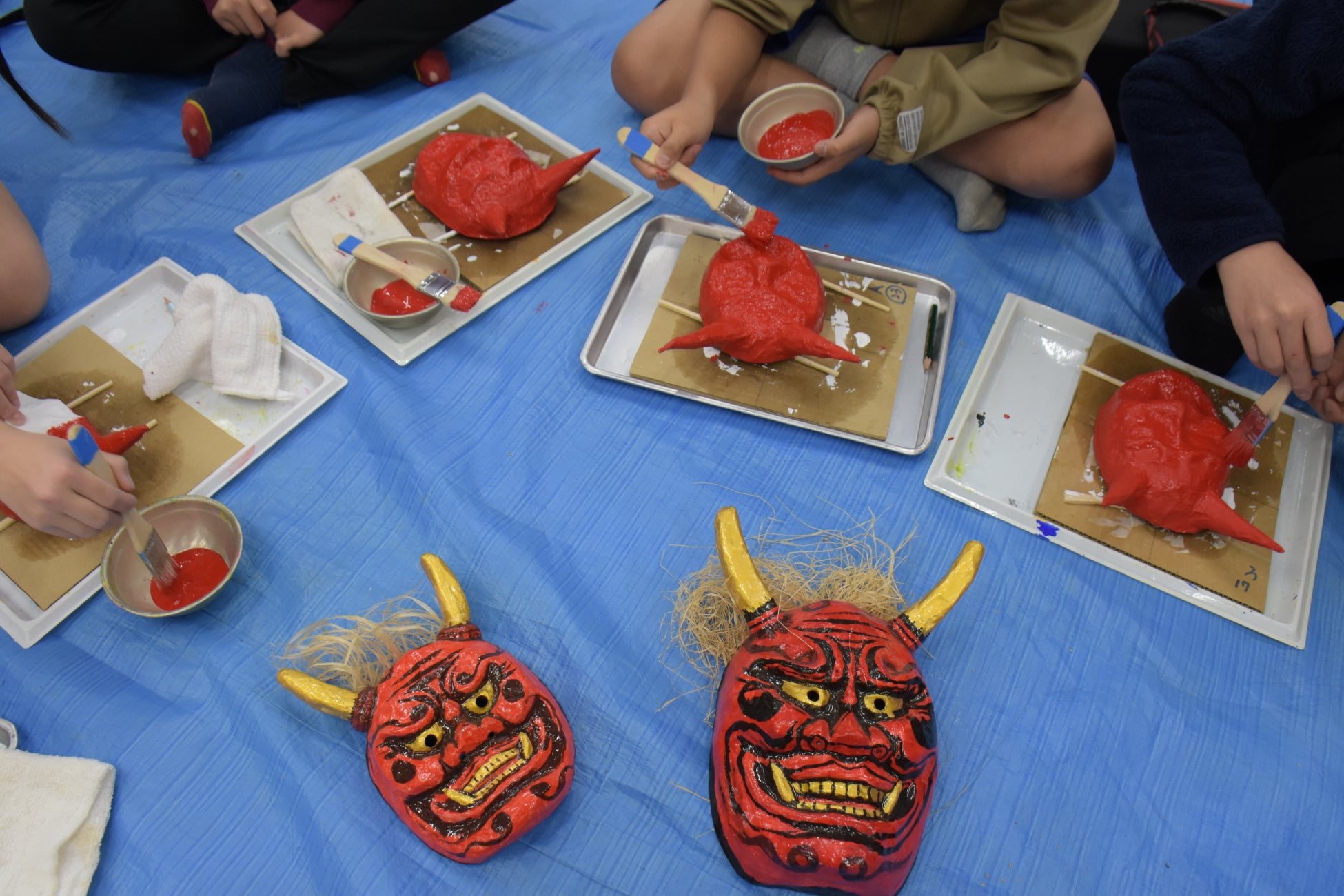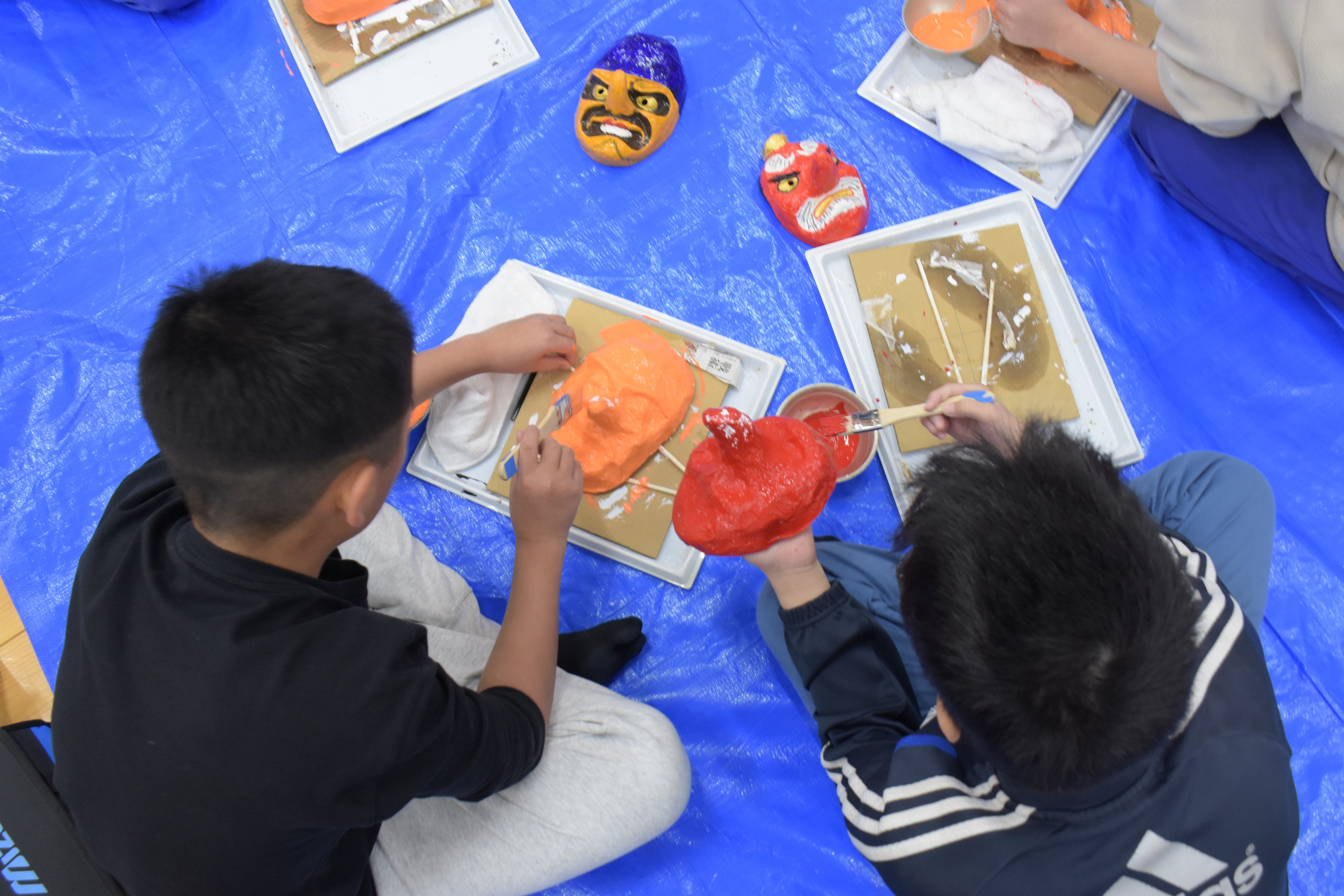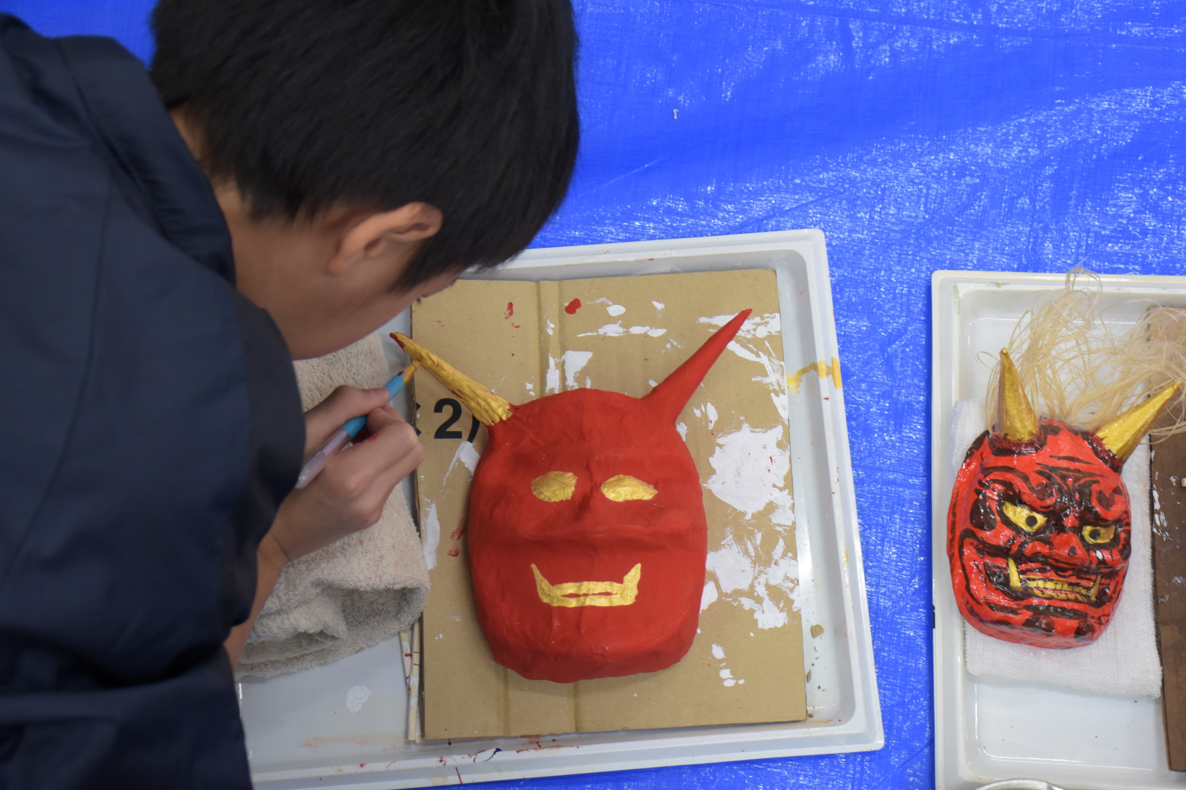 赤や黒、緑など思い思いのアクリル絵の具を選んで塗る児童へ、保存会のメンバーは「鬼の角の裏側もしっかり塗って」と、仕上がりを左右するポイントを伝えていました。