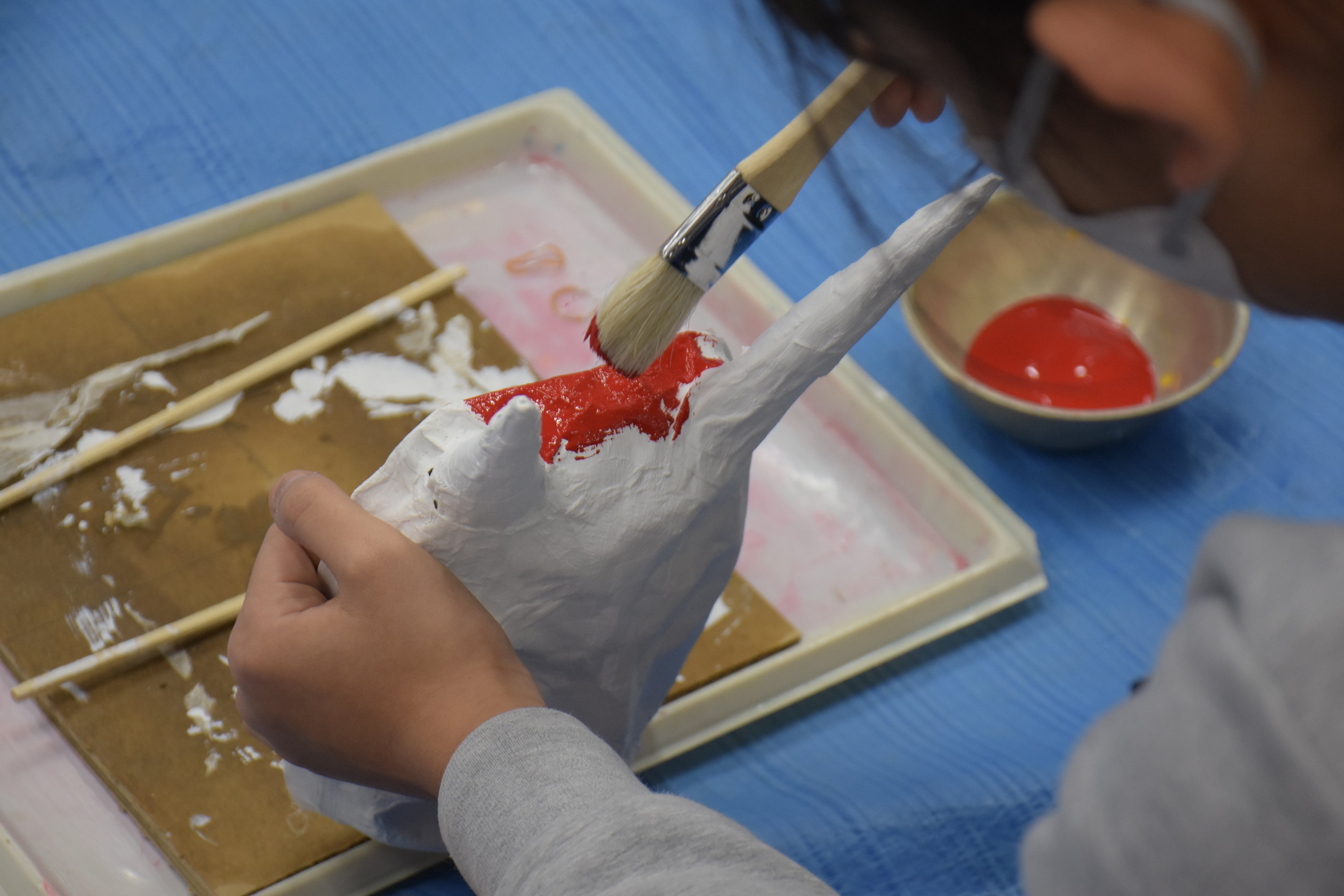 まずは真っ白なお面に、ベースとなる色を刷毛で丁寧に塗っていきます。