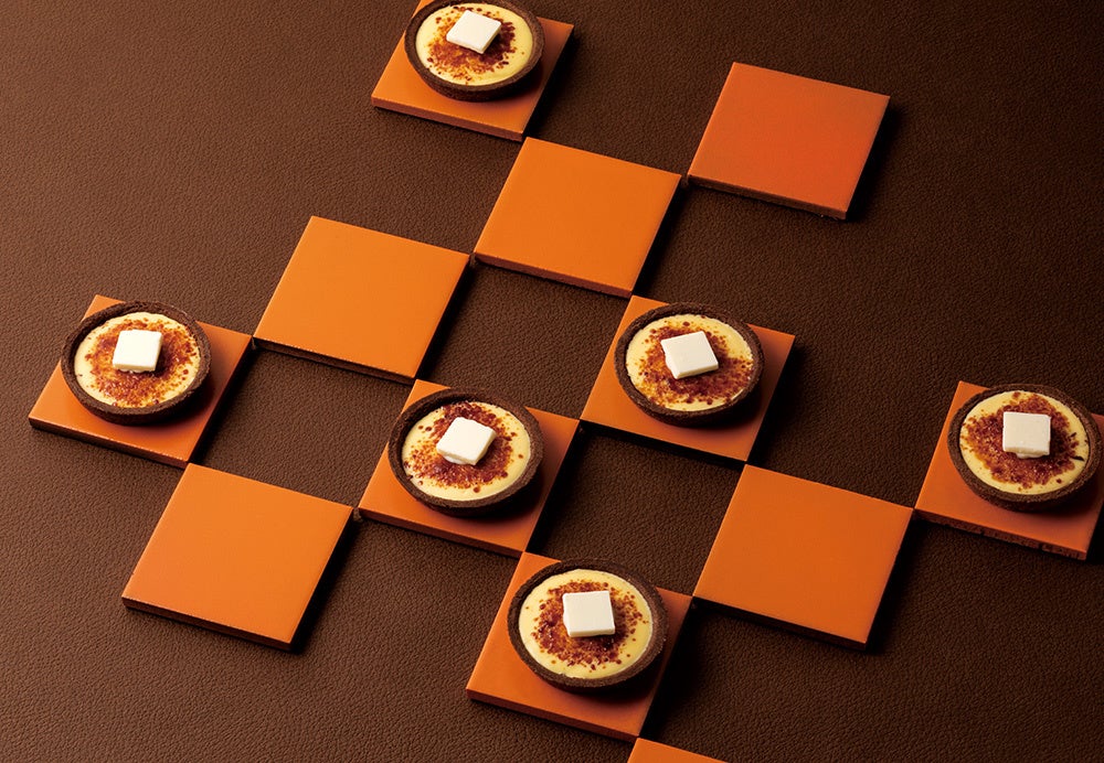 パリン、サクッ、とろりの三重奏をお楽しみください。バニラ香るクリームをパリンとブリュレした、サクッと香ばしいショコラ風味のバタータルト生地。中からとろりとあふれ出すショコラキャラメルソースが、おいしさのひと工夫。四角いバターショコラのコクも浮かべたバレンタインの“ごほうびタルト”です。