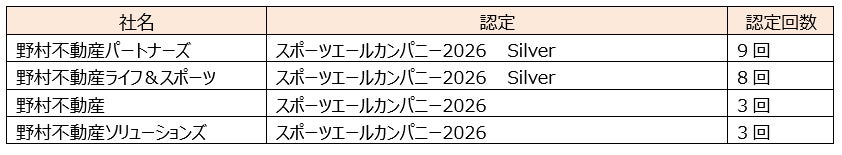 野村不動産ホールディングス株式会社(本社:東京都港区/代表取締役社長:新井 聡、以下「当社」)は、当社グループ4社がスポーツ庁「スポーツエールカンパニー2026」 および東京都「令和7年度東京都スポーツ推進企業」に認定されたことをお知らせします。