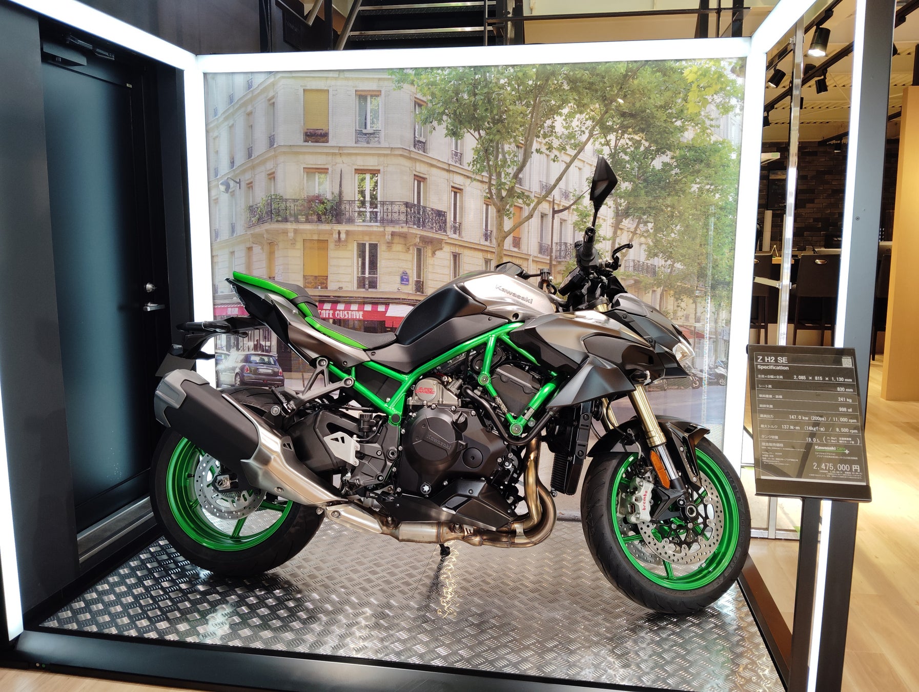新たなオーナーを待つモーターサイクルたちが、ケージの中で静かに眠りについているイメージを光の枠で創出。カワサキプラザならではのアイコニックポイントの一つです。