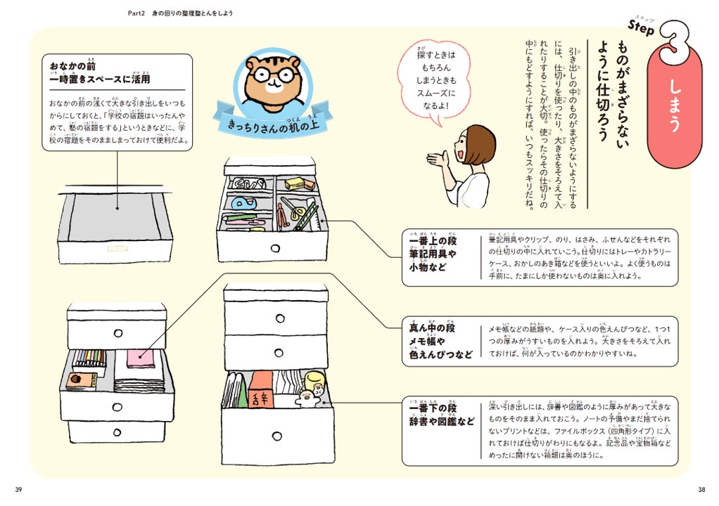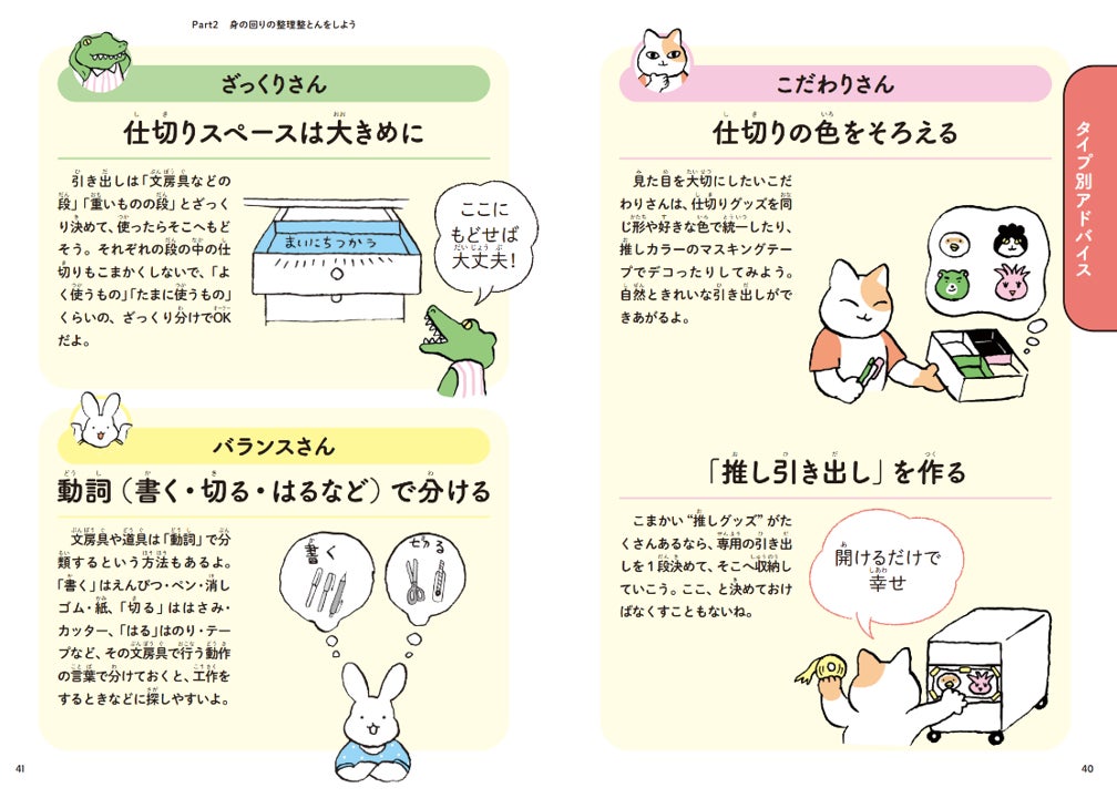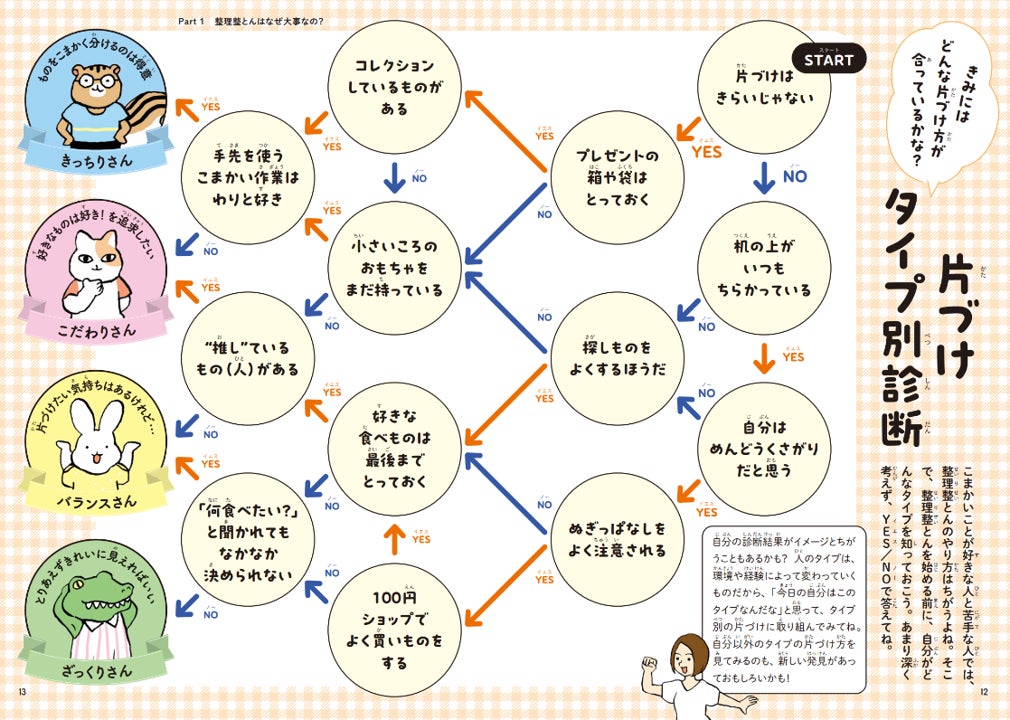 本書では、冒頭でタイプ別診断のフローチャートを使い、子どもたちが自分の傾向を知ることができます。その傾向や個性のタイプ別に片付け方法を紹介しており、自分に合ったやり方で効果的に片付けを始めることができます。
