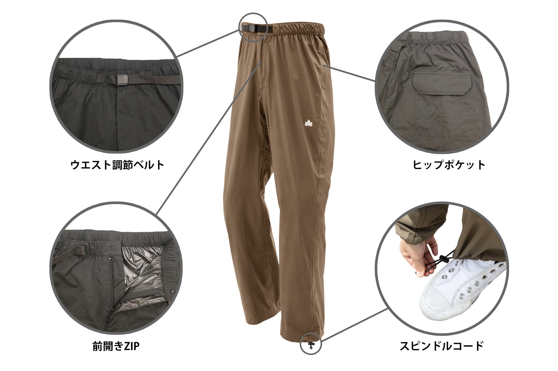 パンツはウエストサイズを簡単に調節できるウエスト調節ベルト付きで、着脱のしやすい前開き仕様。小物の収納に便利な大きめのヒップポケット付きで、裾のスピンドルコードで着用感の調節ができる。