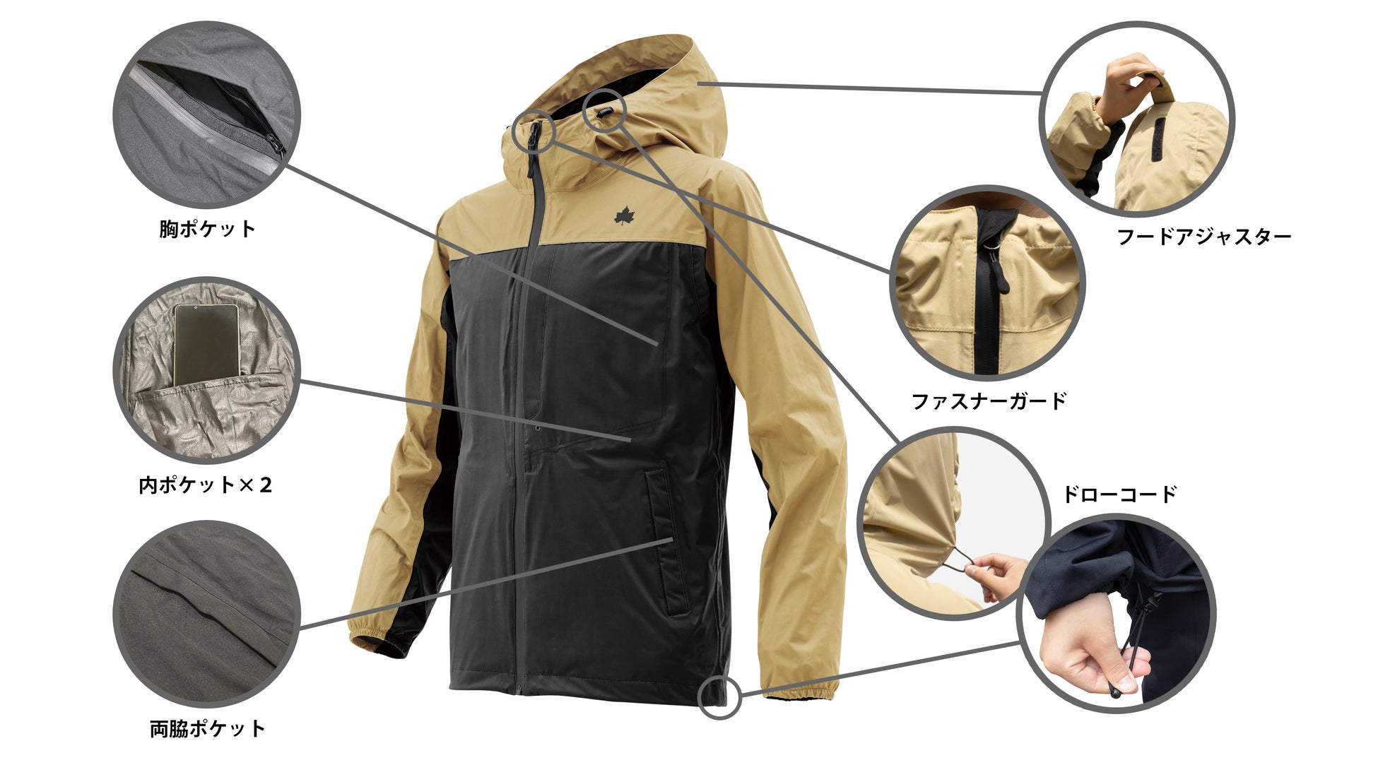 ジャケットは多収納ポケット仕様で、両脇ポケットに加えて、収納力のあるジッパー付き胸ポケット、内ポケットと合計5箇所にポケットを搭載しています。首元は、前立て部分の工夫によりファスナーが直接肌に当たるのを防ぐファスナーガード仕様で、裾と首元はドローコードで着用感の調節ができます。フードアジャスター付きで、フードの長さや角度の調節が可能です。