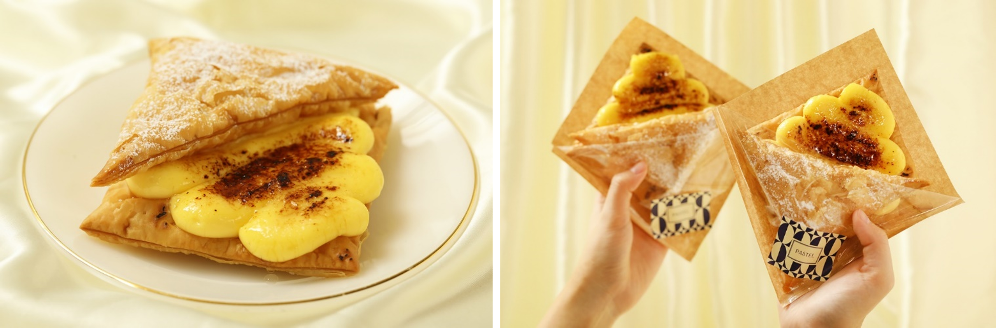 そしてこのたび、流⾏の発信地である表参道エリアで「パステル」を気軽にご利用いただきたいという想いから、ワンハンドでお楽しみいただけるスイーツとして『表参道プリンパイ』を開発、「パステル 表参道店」限定商品として新発売いたします。