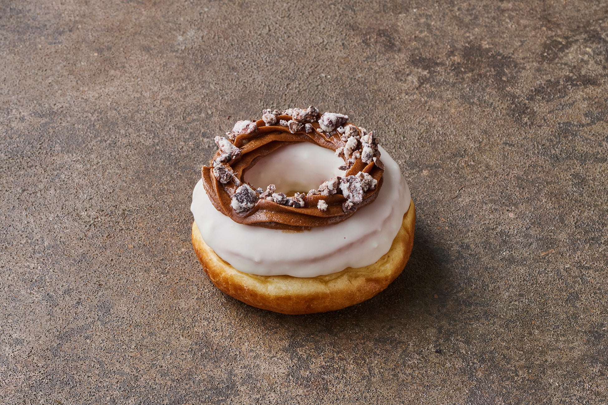 アマゾンカカオとチョコレートグレーズの上に、程よい甘さのカカオバタークリームを絞りました。最後に乗せたザクザクなクランブルの食感が楽しいドーナツです。